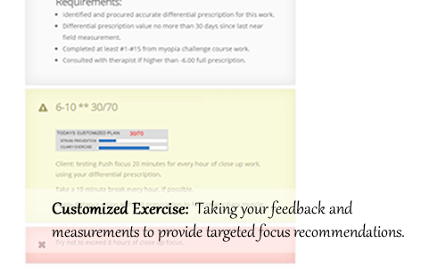 This entirely unique approach to making vision practice recommendations helps us bridge the gap between one-on-one therapist guidance, and the hands off approach of a Web-based program. As every myopia case is unique and rehab progress varies widely, this gives you the applications to continue to adjust progress to your needs.