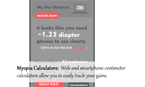 Use our centimeter measurement system (Android app now available as well) to gauge vision improvements and strain throughout the day. Input data into your exercise tool to receive customized recommendations for the following set of days.